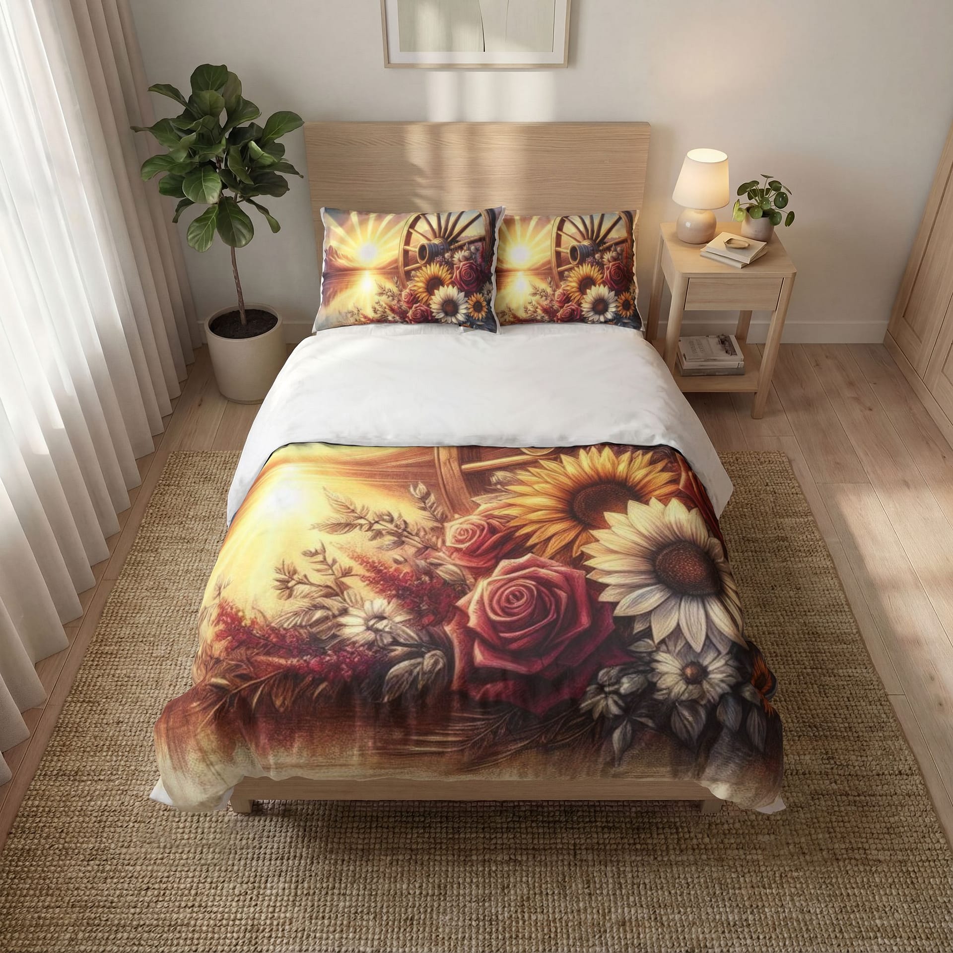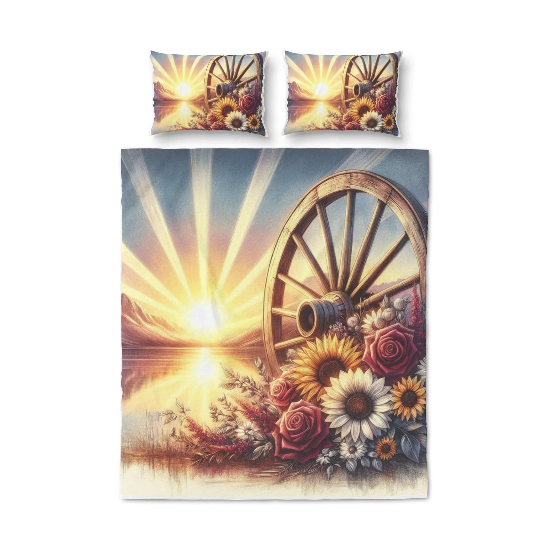 Wake up to a warm, golden sunrise every morning with this three-piece quilt cover set. The artwork blends a vintage wagon wheel with sunflowers, roses and soft rays of light, creating a nostalgic, countryside atmosphere that settles the room. Lightweight polyester drapes smoothly over the bed while the serrated cuffs and hidden color-matched zipper keep seams tidy and secure. Single-sided printing preserves the detailed, vibrant colors where they matter most. This set includes two matching pillow covers that echo the duvet’s sunrise motif to tie the whole look together and bring a calm, rustic glow to your bedroom.