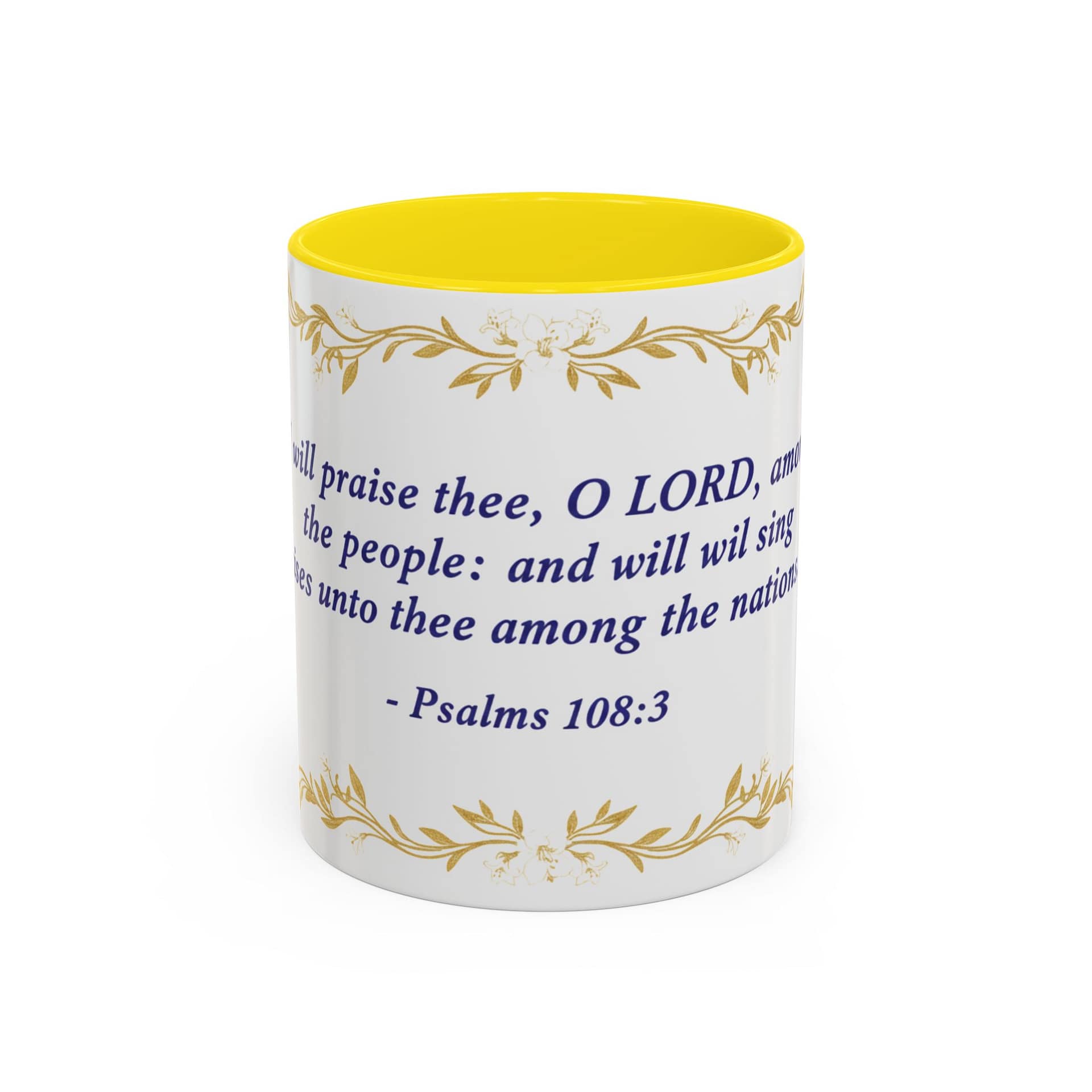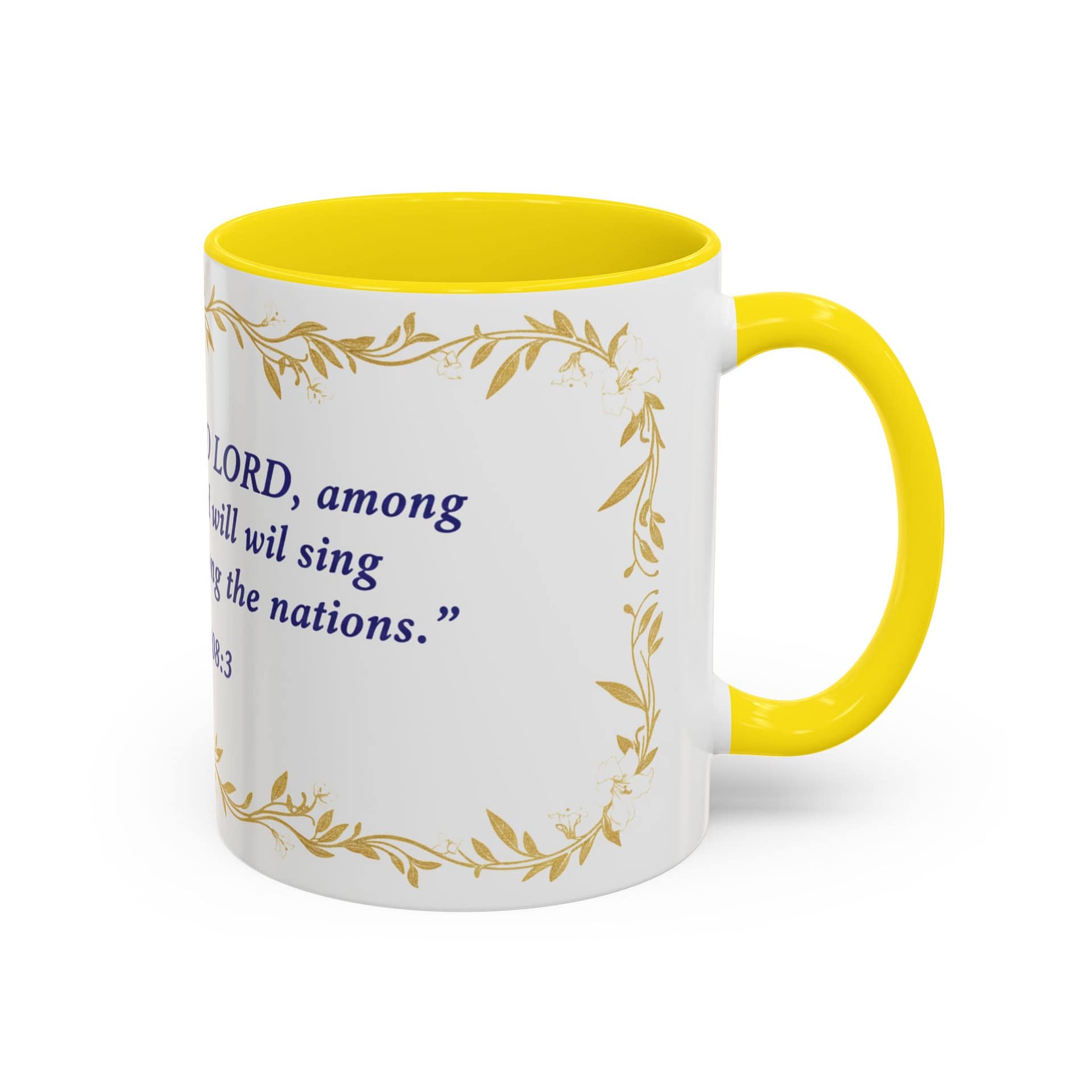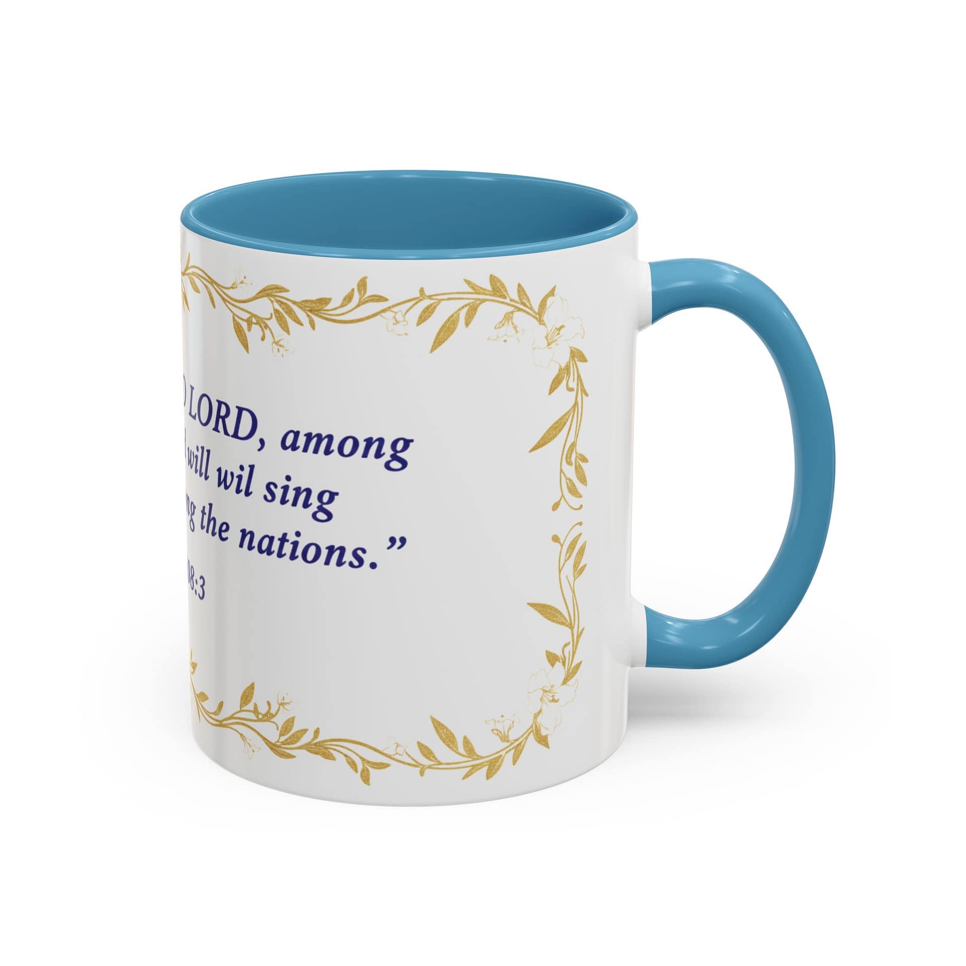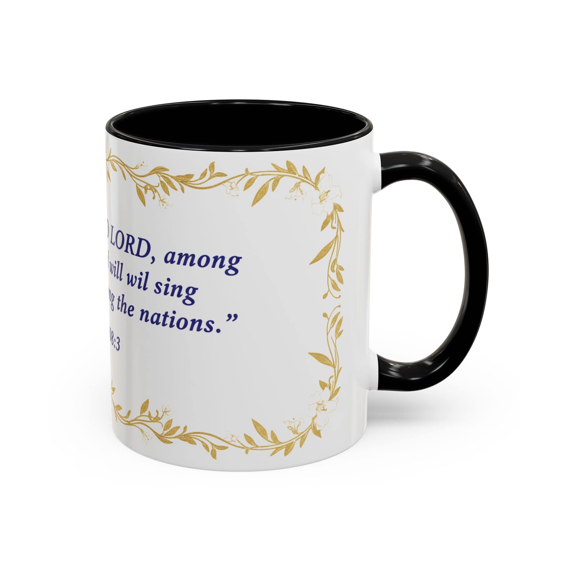 Warmth pours from this ceramic mug like morning light. A soft cream background cradles a reverent verse from Psalms 108:3 set in deep indigo, framed by delicate, golden vine accents. It feels like a quiet, Sunday morning: slow sips, folded hands, and a moment to breathe. The colored interior and handle add a subtle contrast that lifts the design without shouting, while the glossy finish keeps the look elegant and easy to care for. Bring this mug to your daily routine when you want a gentle reminder of faith woven into small, ordinary rituals — a companion for prayer, study, or reflective breaks between a busy day.
