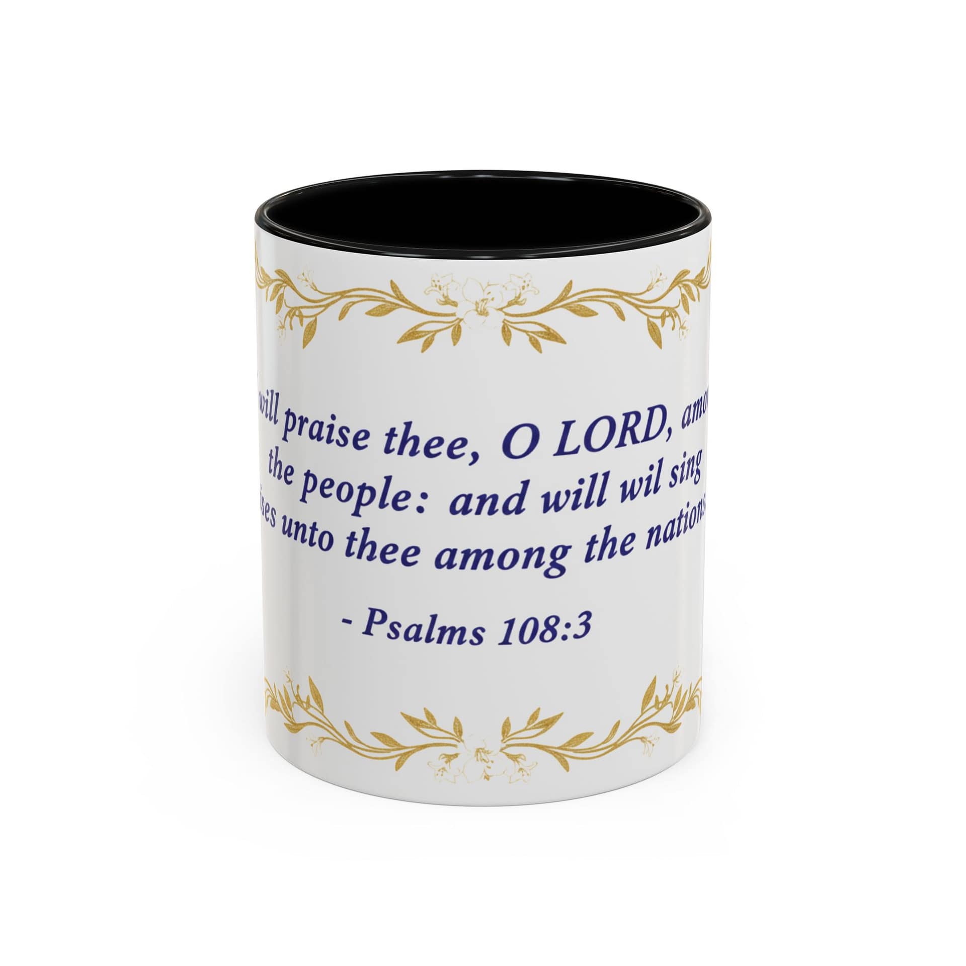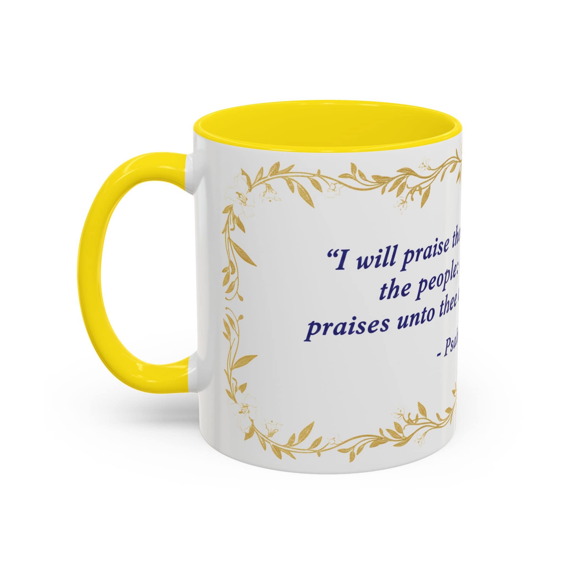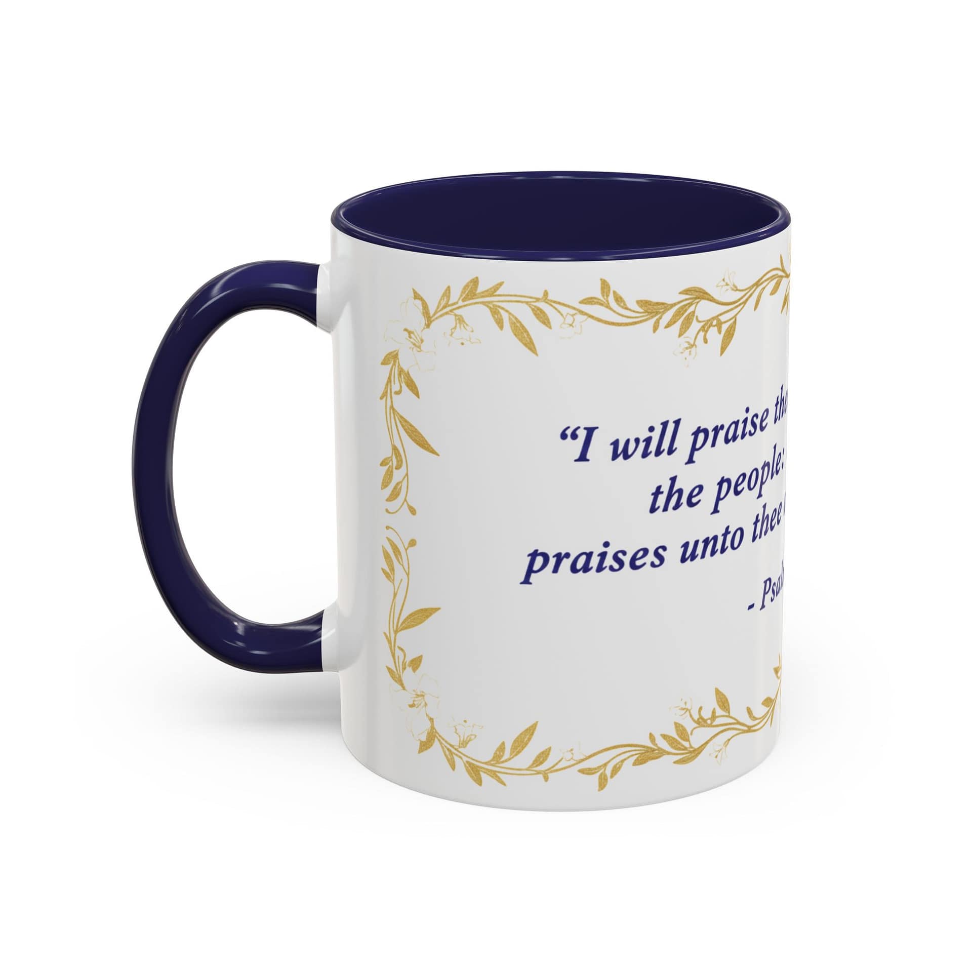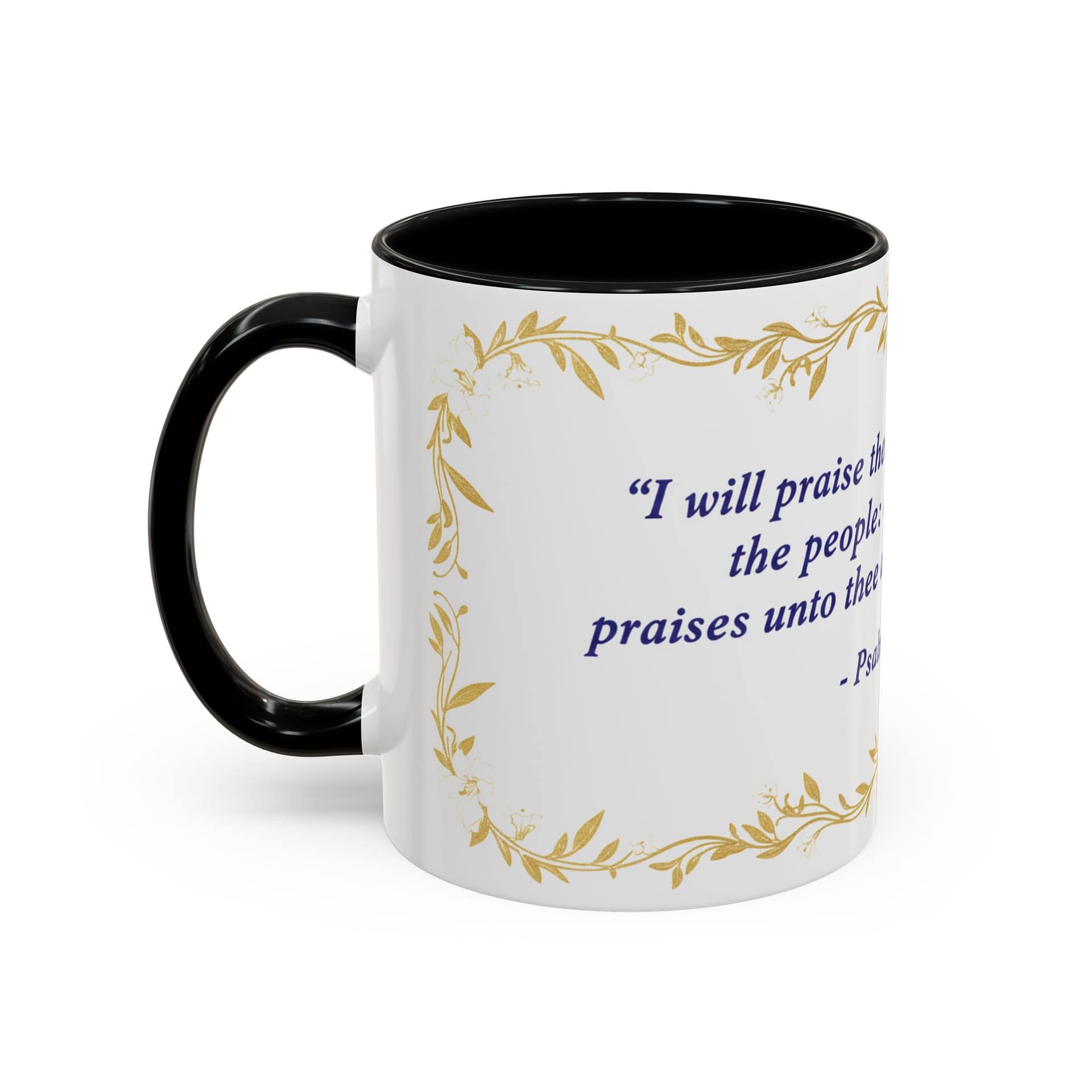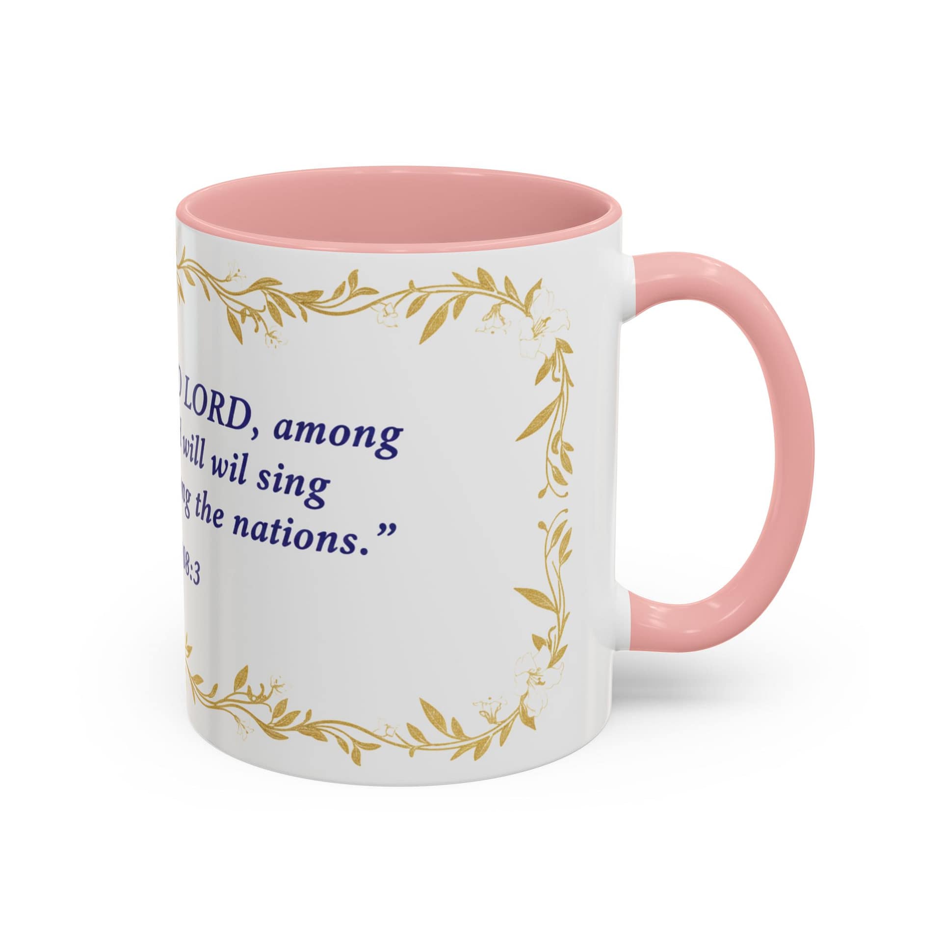 Warmth pours from this ceramic mug like morning light. A soft cream background cradles a reverent verse from Psalms 108:3 set in deep indigo, framed by delicate, golden vine accents. It feels like a quiet, Sunday morning: slow sips, folded hands, and a moment to breathe. The colored interior and handle add a subtle contrast that lifts the design without shouting, while the glossy finish keeps the look elegant and easy to care for. Bring this mug to your daily routine when you want a gentle reminder of faith woven into small, ordinary rituals — a companion for prayer, study, or reflective breaks between a busy day.