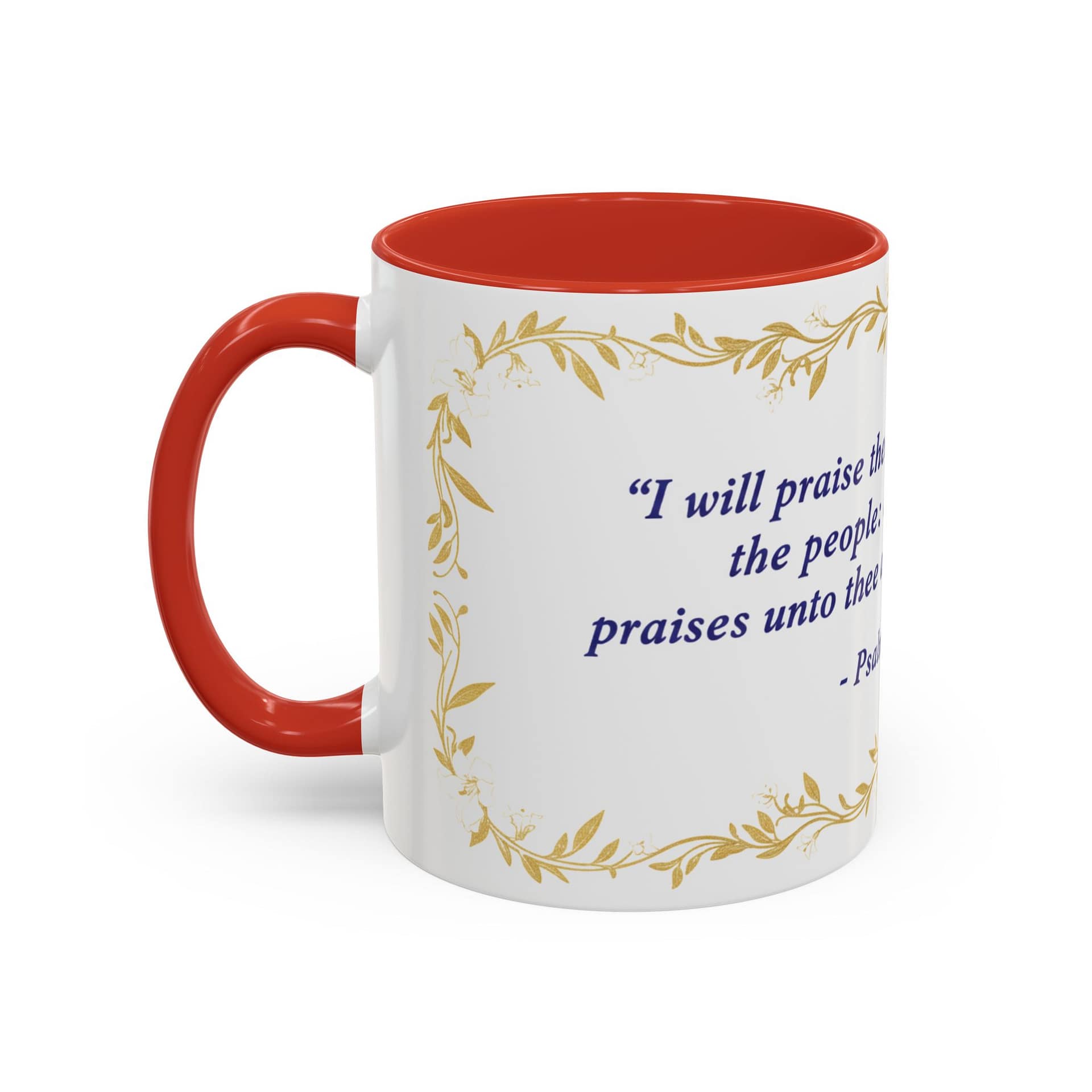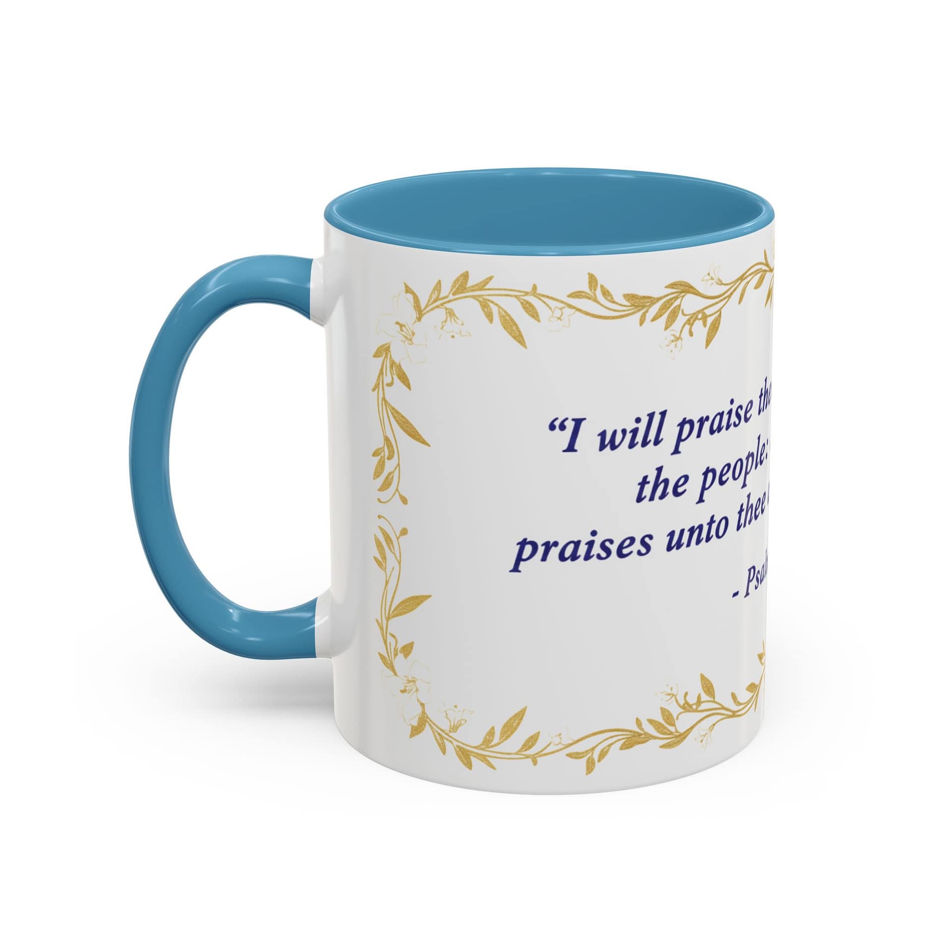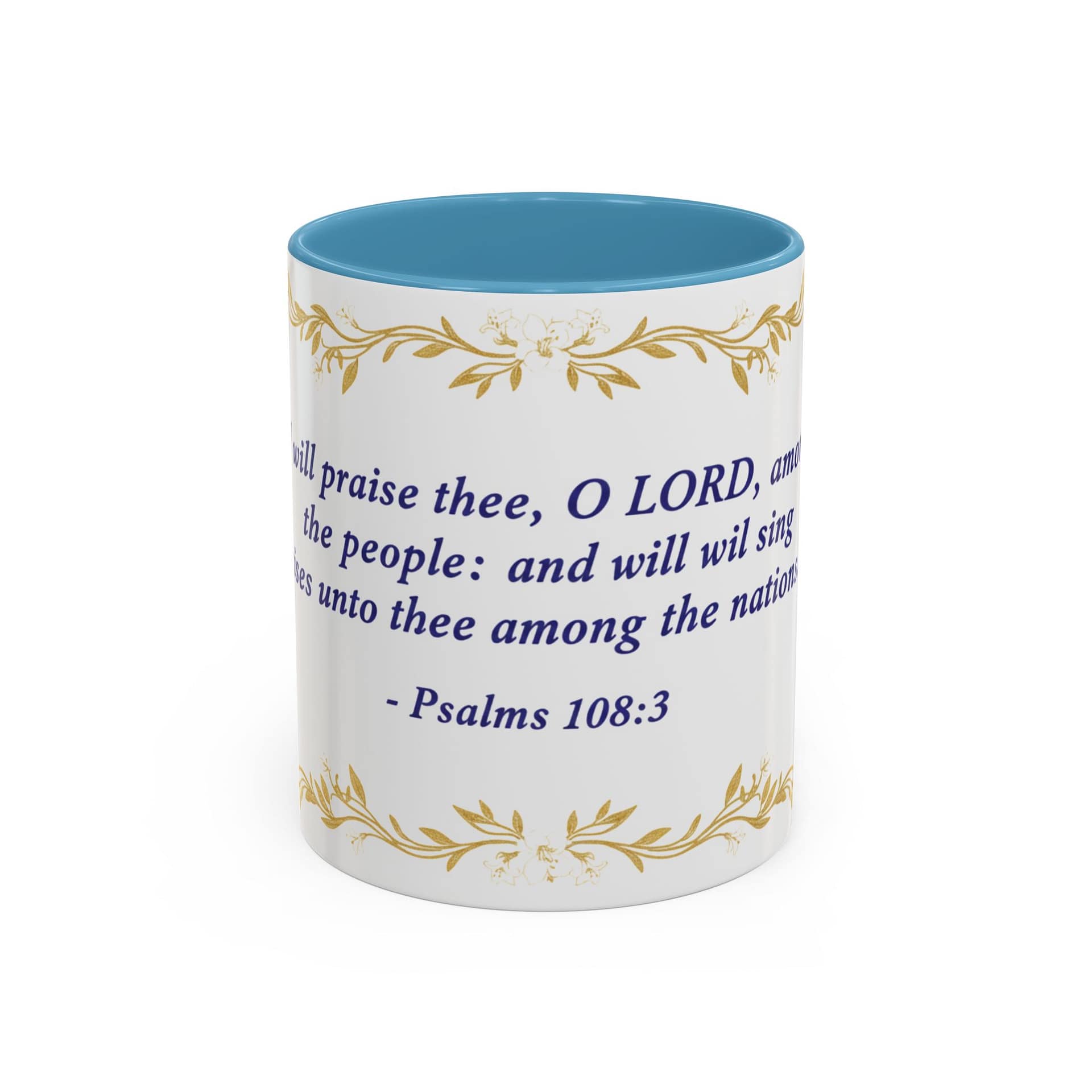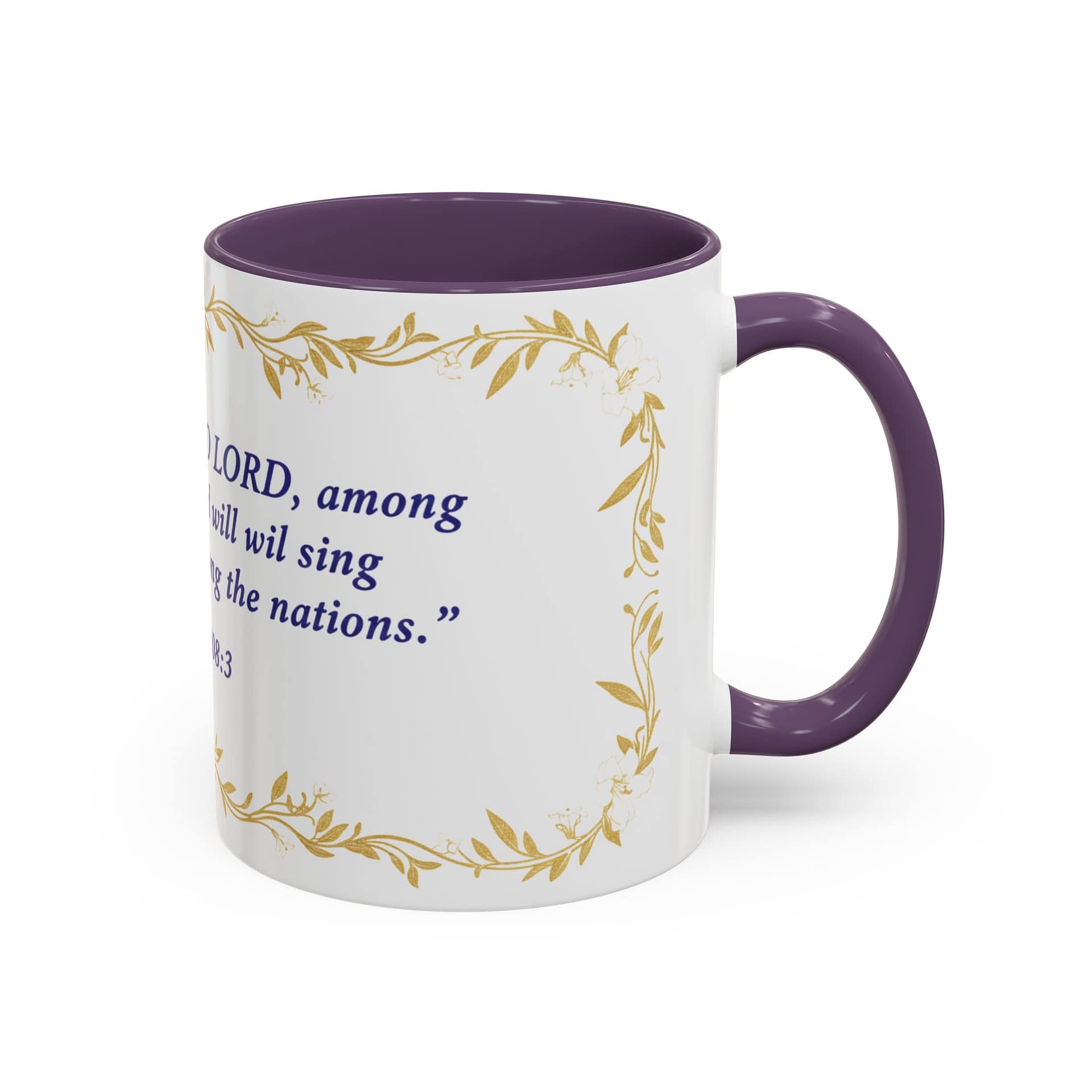 Warmth pours from this ceramic mug like morning light. A soft cream background cradles a reverent verse from Psalms 108:3 set in deep indigo, framed by delicate, golden vine accents. It feels like a quiet, Sunday morning: slow sips, folded hands, and a moment to breathe. The colored interior and handle add a subtle contrast that lifts the design without shouting, while the glossy finish keeps the look elegant and easy to care for. Bring this mug to your daily routine when you want a gentle reminder of faith woven into small, ordinary rituals — a companion for prayer, study, or reflective breaks between a busy day.