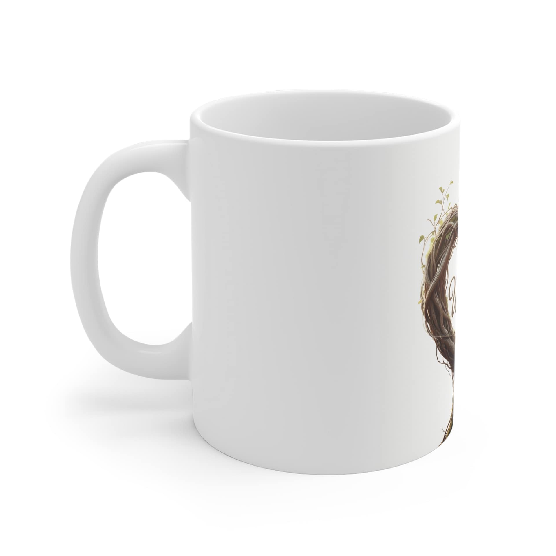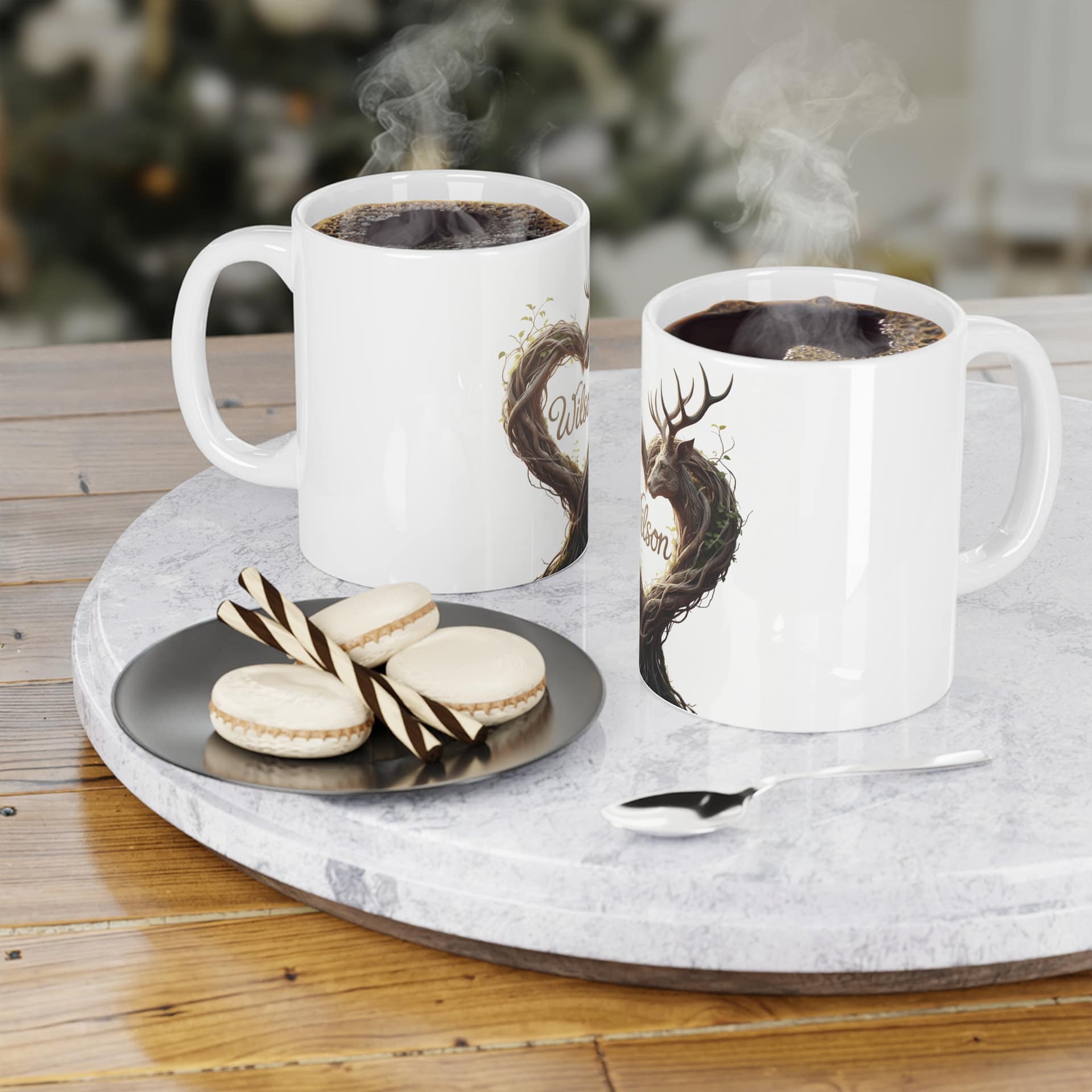 Warm morning light, soft steam rising, and a quiet moment with a hand-wrapped story. This ceramic mug carries an artful woodland motif — a deer whose antlers and flowing branches form a heart around a name — bringing a gentle, nature‑touched presence to everyday sips. The smooth white ceramic background makes the illustration feel like a painted keepsake. It’s the sort of mug that settles into slow breakfasts, desk-side moments between meetings, and evenings curled up with a book. The design feels personal without shouting, inviting memories of forest walks, cozy cabins, and the calm of being known.